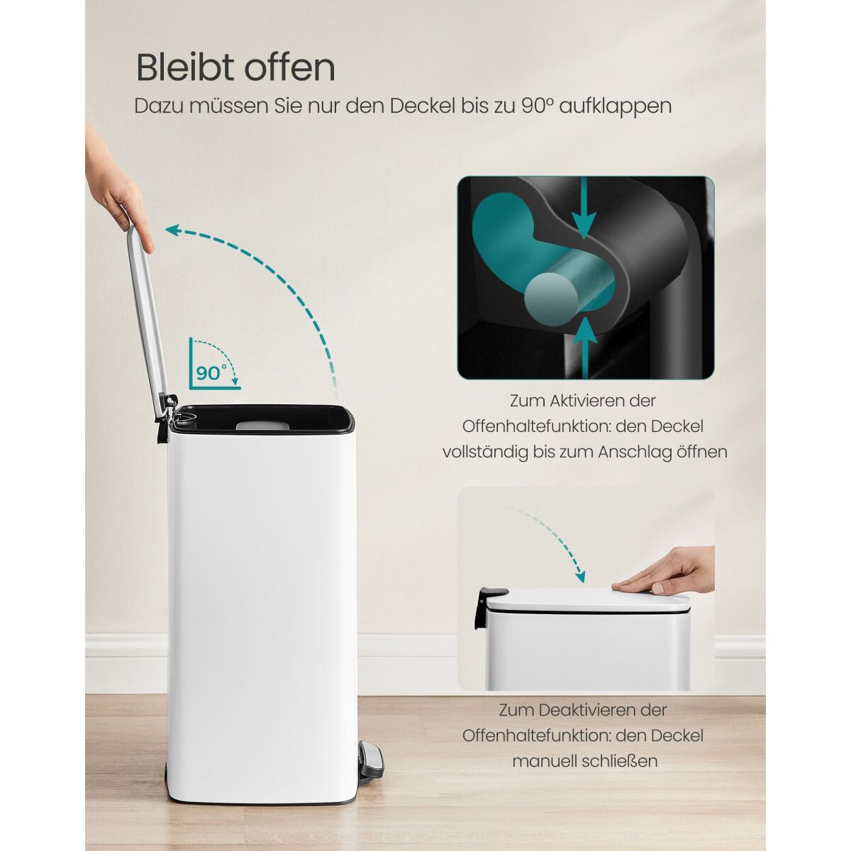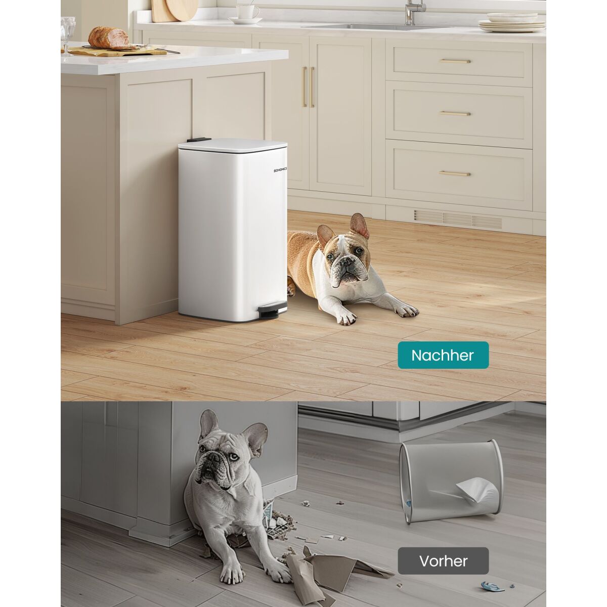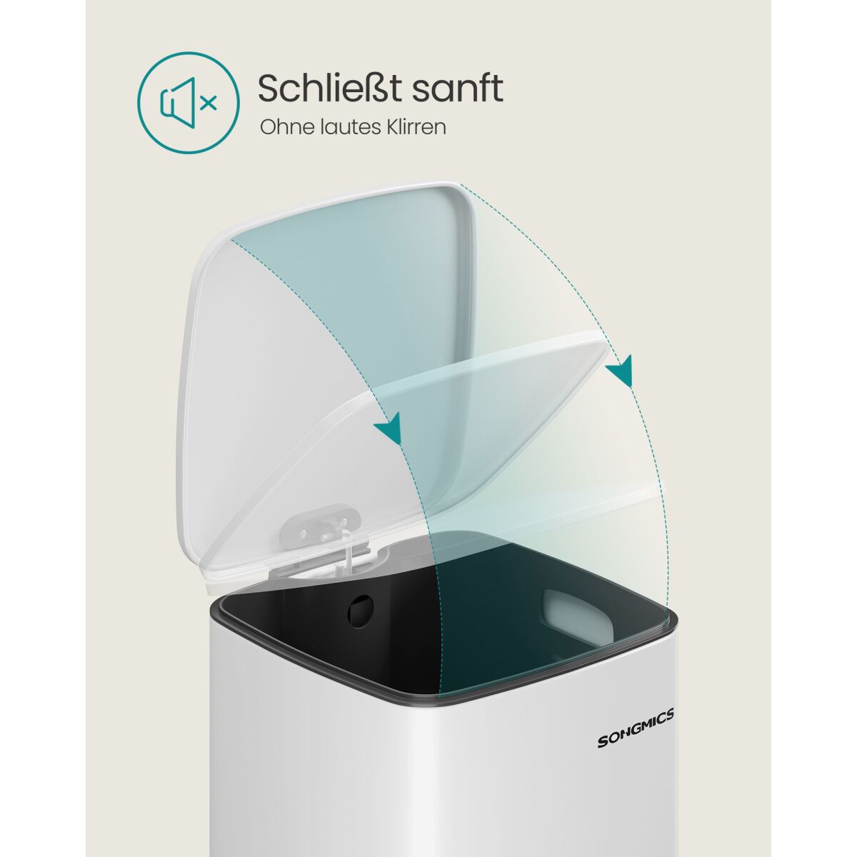 Elegantly crafted to blend functionality with aesthetics, this SONGMICS pedal trash can is an essential addition to any sophisticated kitchen. Designed in a serene cloud white hue and constructed from high-quality steel and durable PP plastic, this trash bin not only promises longevity but also adds a touch of refined taste to your space. Featuring a handy 20-liter capacity and an inner bucket, it facilitates effortless waste disposal and easy cleaning. The soft close mechanism ensures a silent closure, preventing slam noises and enhancing the calm environment of your home. Additionally, the stay-open function is particularly useful during longer usage tasks. This meticulously designed trash bin combines practicality with elegance, ensuring a seamless and tidy kitchen experience.