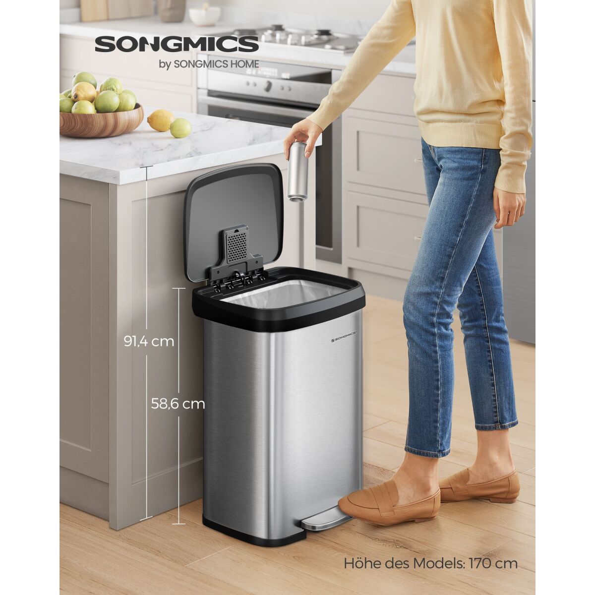 This sleek and modern SONGMICS kitchen trash can combines functionality and style, featuring a durable steel and PP plastic construction with a convenient foot pedal for hands-free operation. Its tall and slim design fits seamlessly into any kitchen, offering a generous 50-liter capacity to accommodate your waste needs while maintaining a clean, sophisticated appearance.