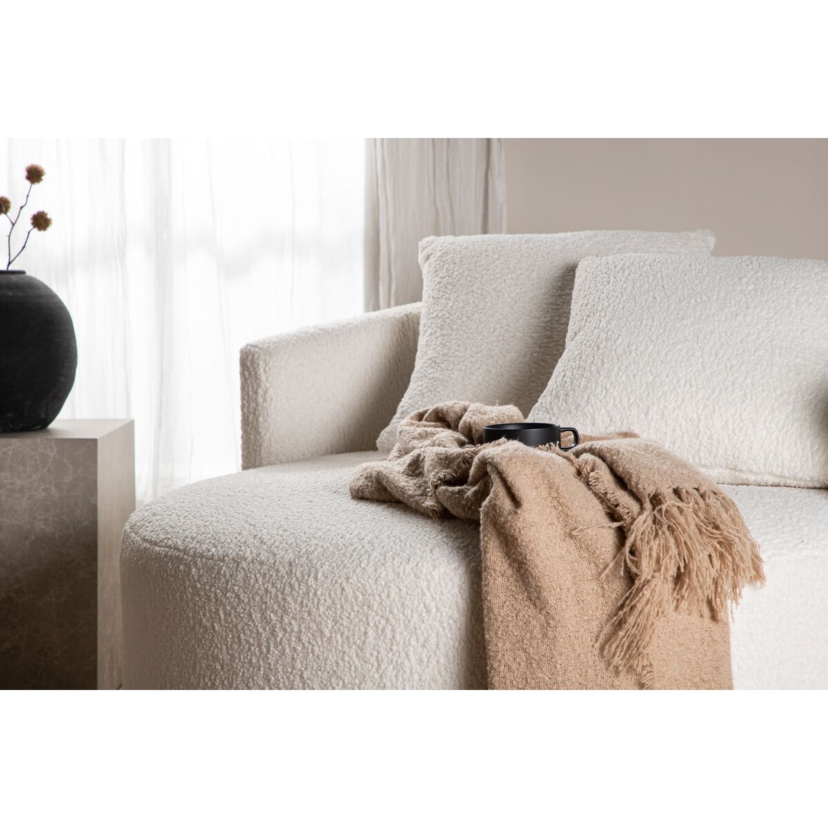 A romantic two-seat sofa with inviting round design and cozy design will surely raise the style level in your home! The sofa from the Kelso series belongs to the Venture Home collection and has a fully dressed upholstery in white teddy fabric with a rounded back, cylinder -shaped seat and two pillows. This sofa fits perfectly in the modern home and quickly creates a pleasant eye -catcher in the living room!