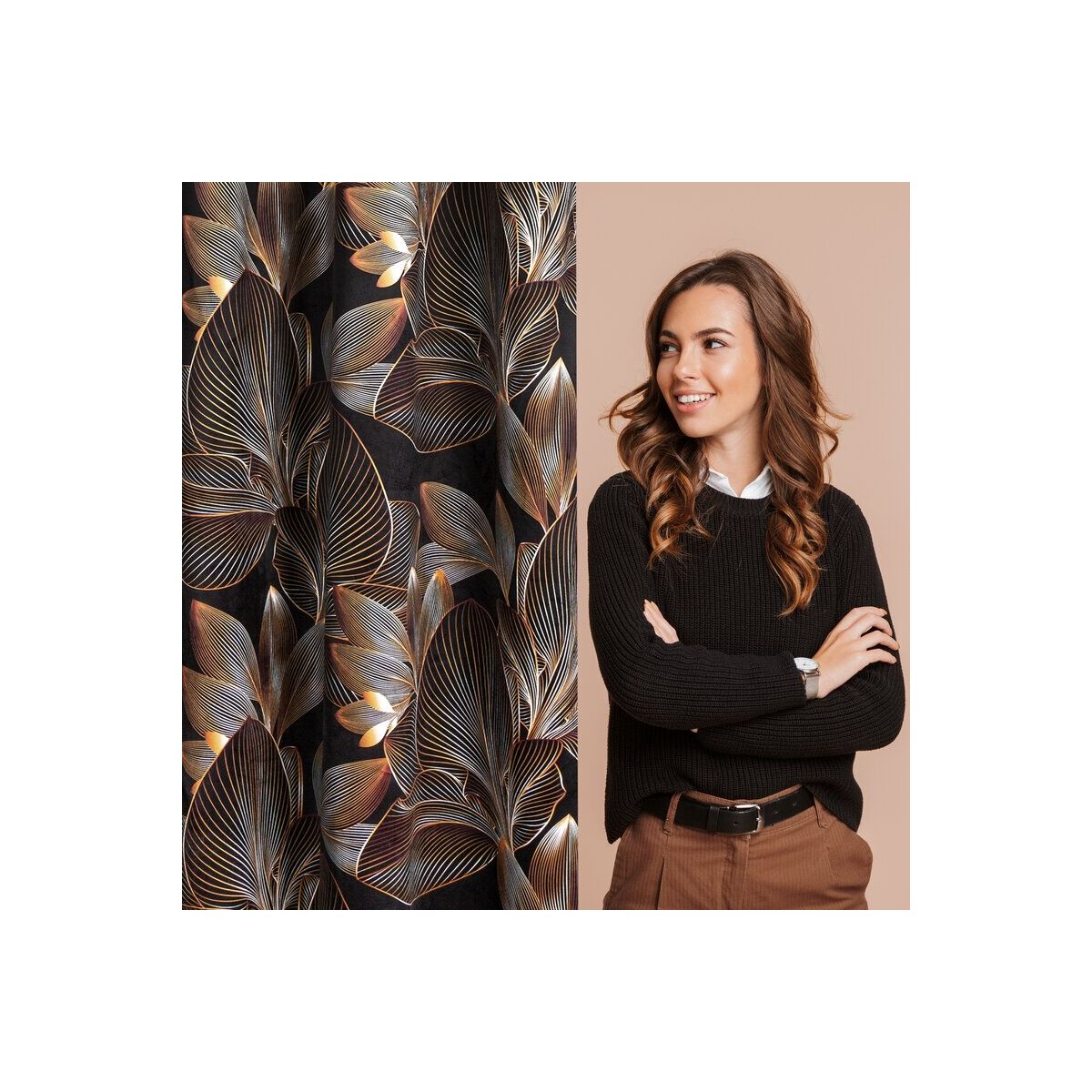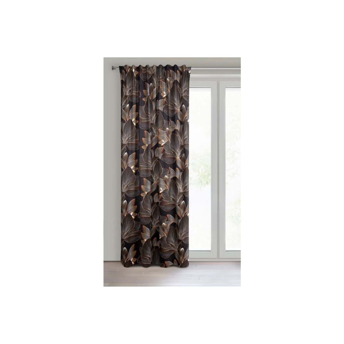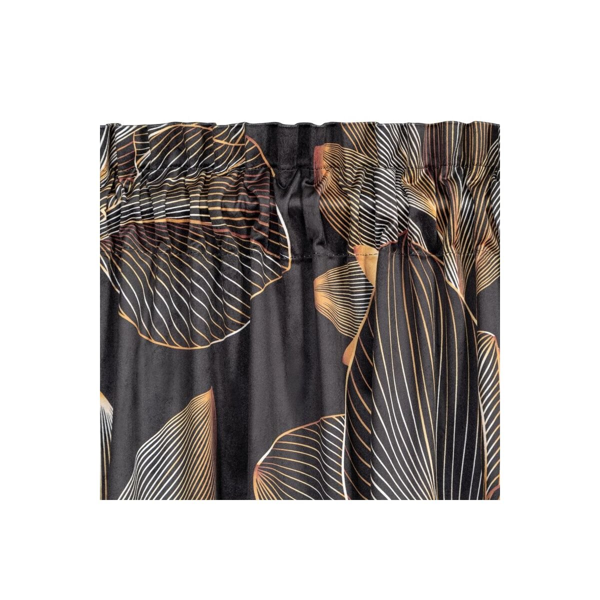 Velvet curtain with a floral print on a tape with concealed tabs, width: 140 cm, length: 270 cm, color: black. Made from 100% polyester, this curtain has a density of 200 GSM.