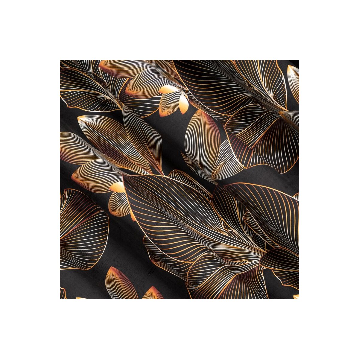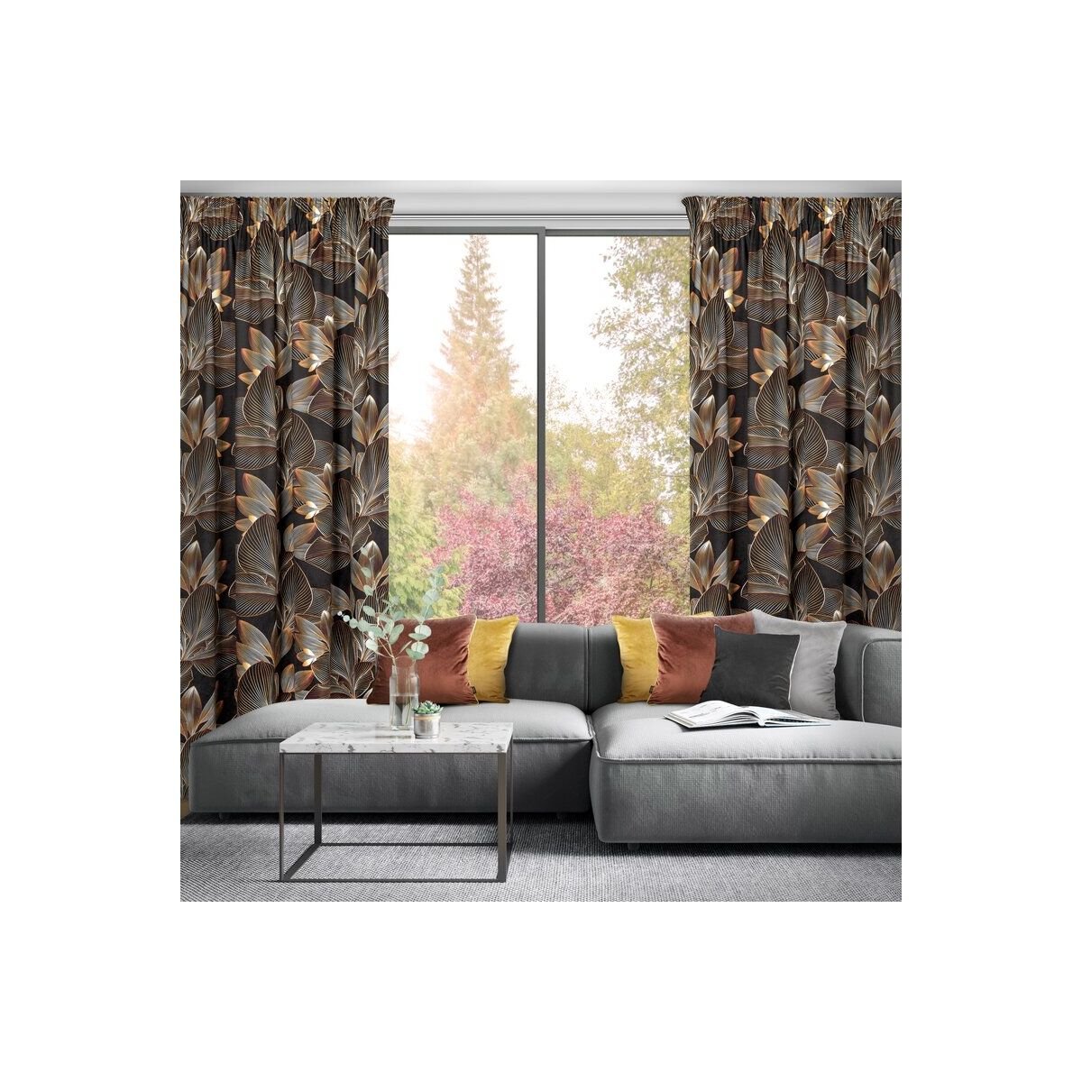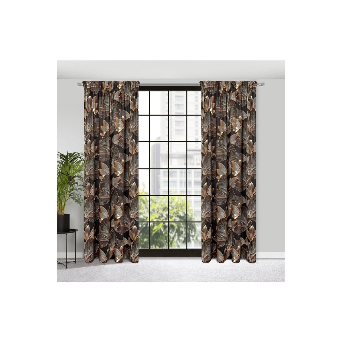 Velvet curtain with a floral print on a tape with concealed tabs, width: 140 cm, length: 270 cm, color: black. Made from 100% polyester, this curtain has a density of 200 GSM.