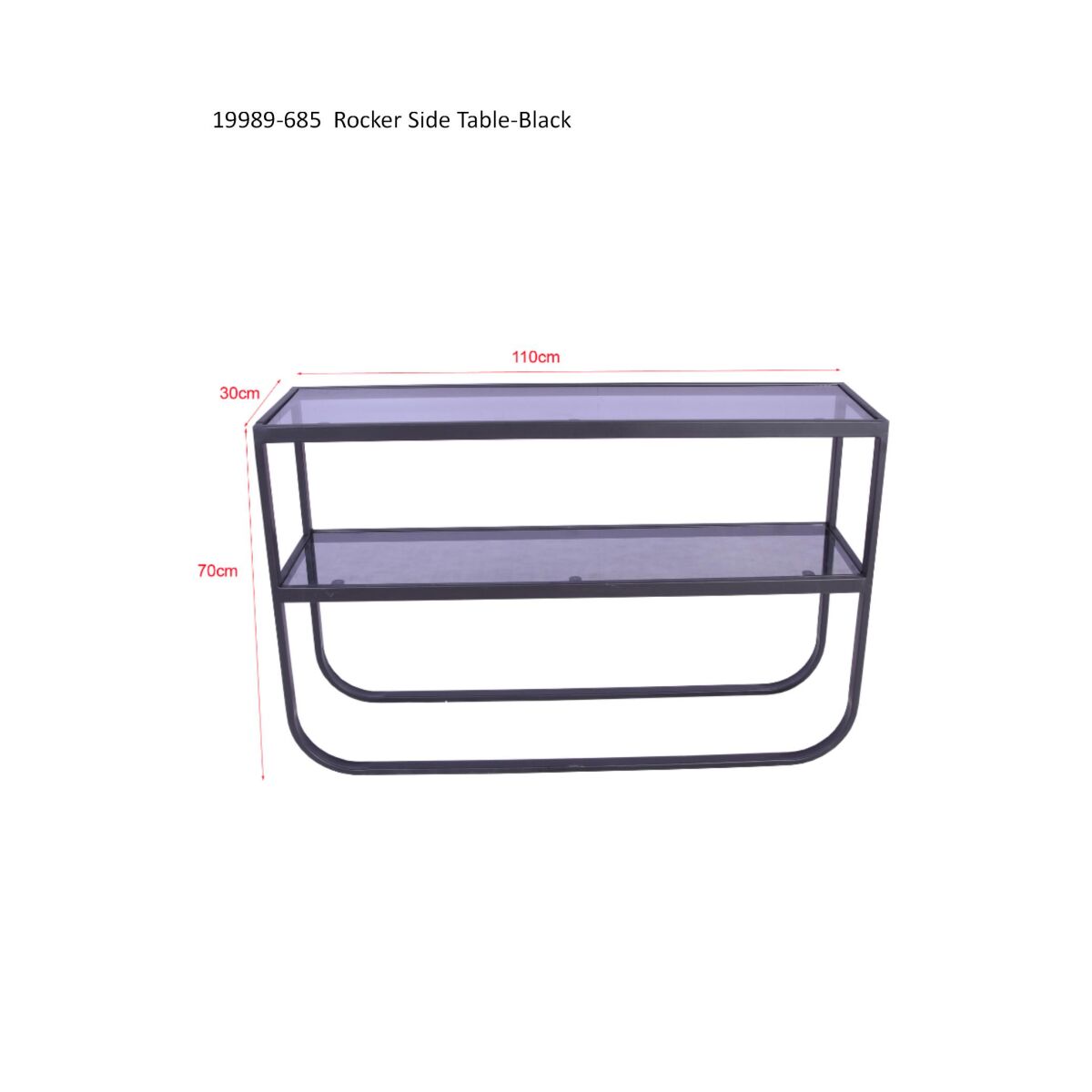 Introducing the sleek and sophisticated Rocker Side Table, a stunning addition to any indoor space. The table boasts a contemporary design with a luxurious black and gray smokey glass tabletop, elegantly supported by sturdy steel legs. Its streamlined dimensions of 110 x 30 cm make it an ideal choice for narrow spaces, while the elegant black powder coating finish enhances its modern appeal. The table top is crafted from high-quality glass, a mere 0.8 cm thick, ensuring a minimalist aesthetic without compromising durability.