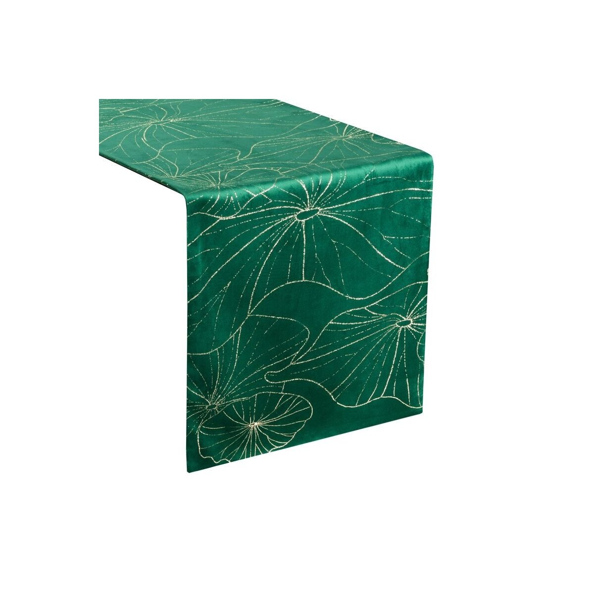 Velvet table runner adorned with a champagne pattern. Width: 35 cm, Length: 180 cm, Color: dark green. Fabric weight: 250 GSM. Composition: 100% polyester.