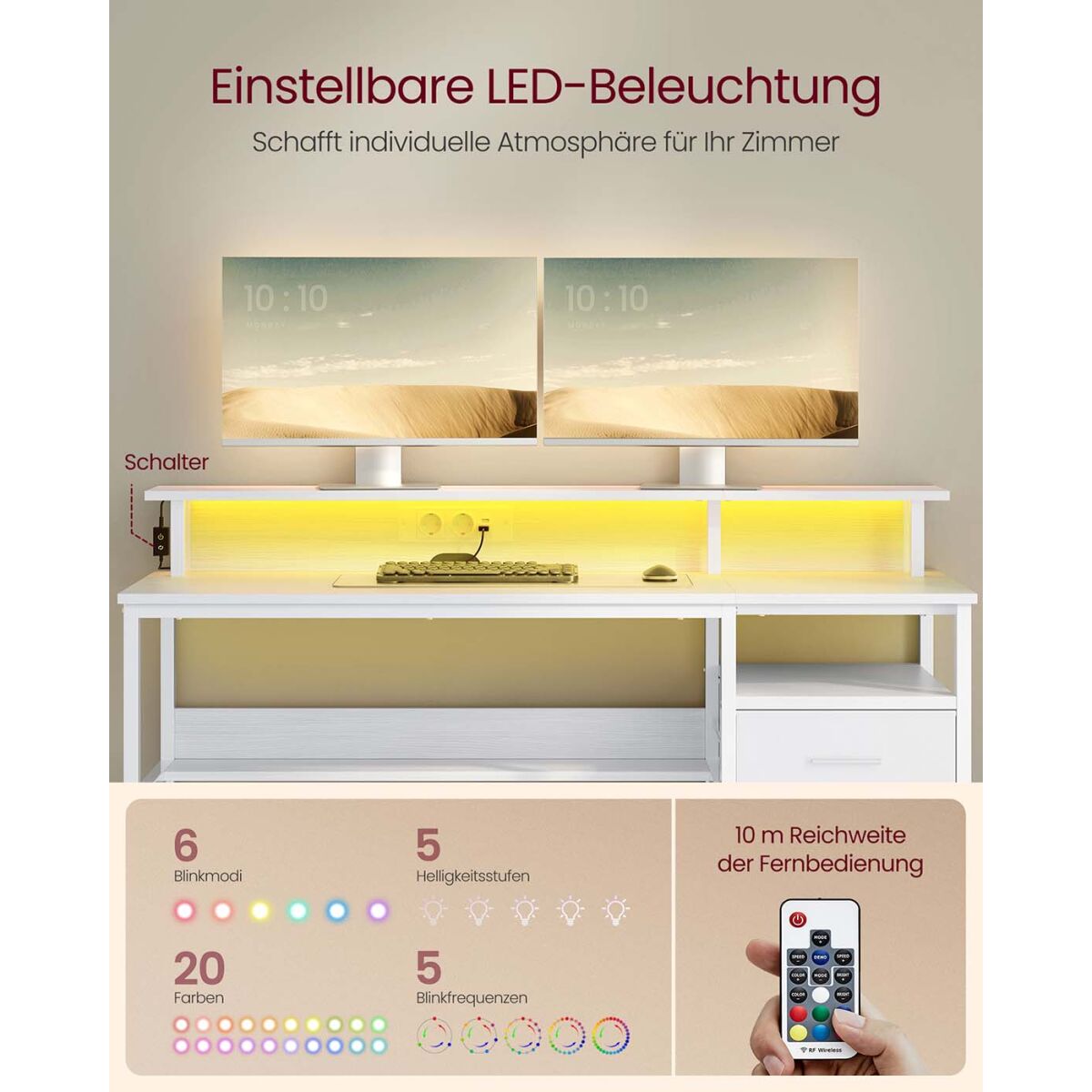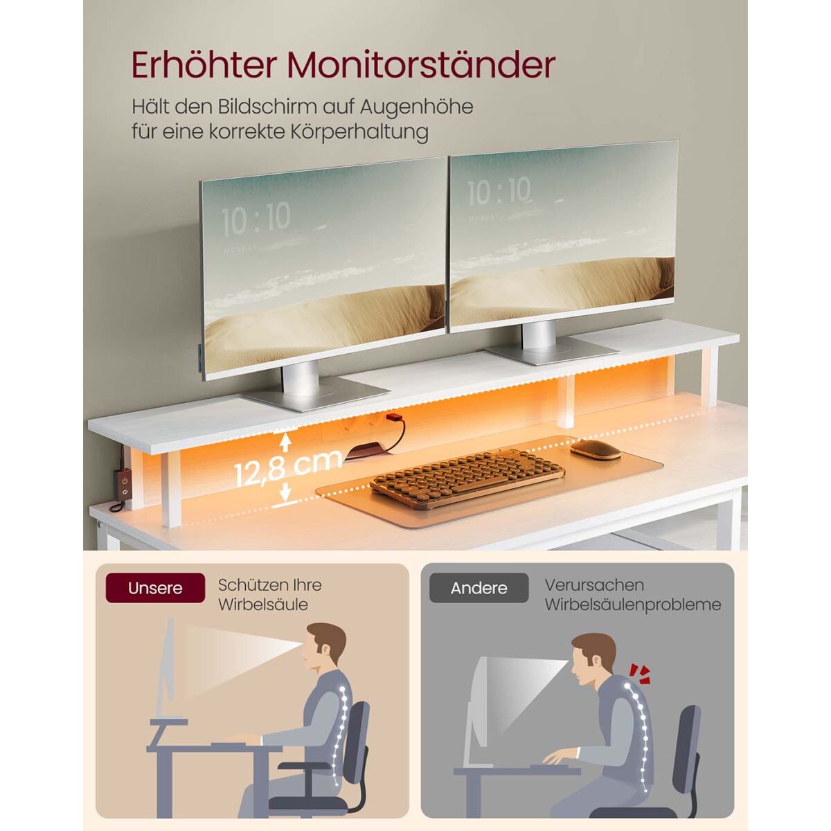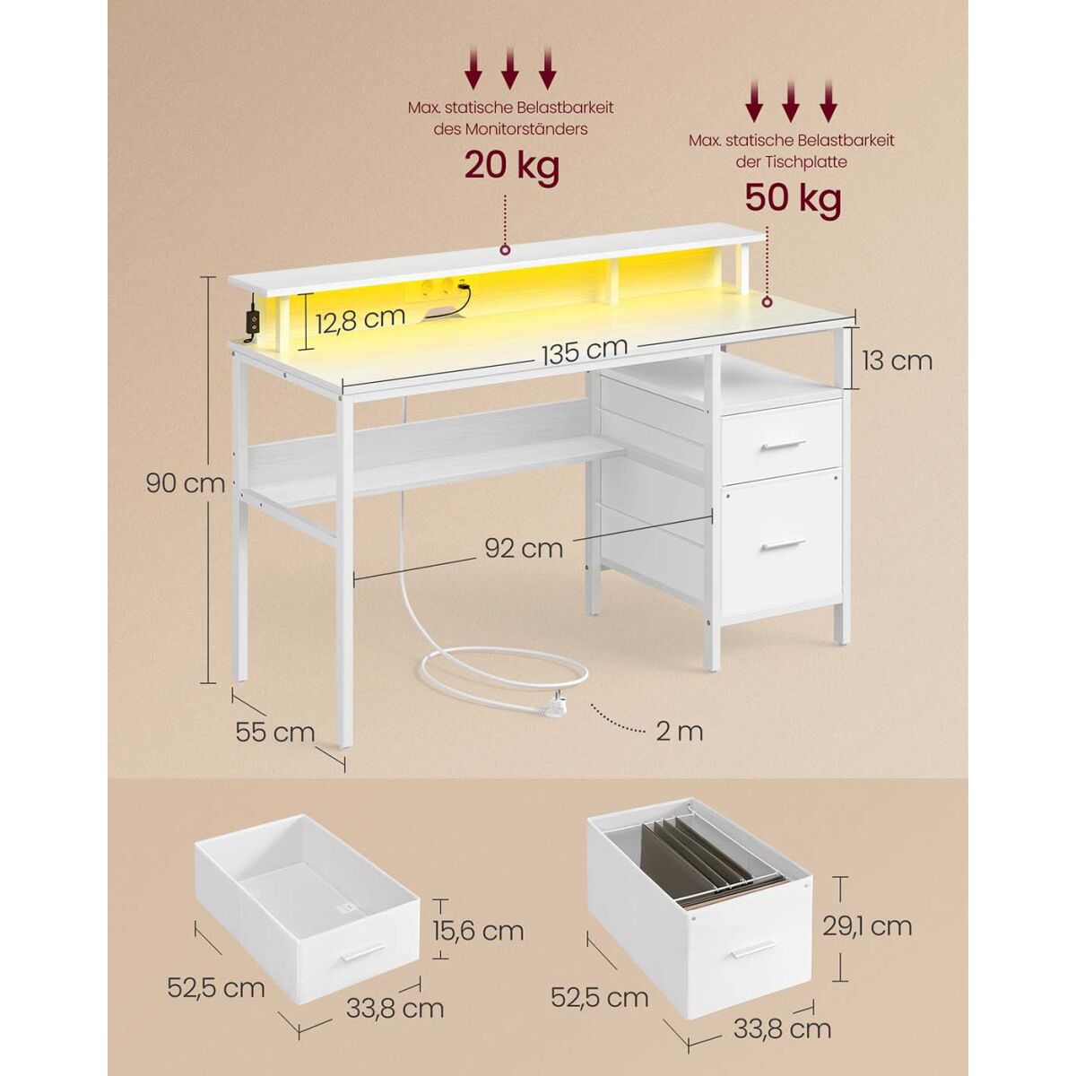 Kirjutuslaud sahtlite ja monitorialusega, LED valgustuse ja sisseehitatud pistikupesadega, ideaalne kodukontorisse. Mõõtmed: 55 x 135 x 90 cm, värv: vahtra valge. Valmistatud kvaliteetsetest materjalidest nagu puitlaastplaat, teras ja mittekootud kangas. Toote kaal on 24 kg. Lauaplaadi maksimaalne staatiline kandevõime on 50 kg ja monitorialuse maksimaalne kandevõime on 20 kg. See stiilse ja funktsionaalse disainiga laud on varustatud kahe USB pordiga ning toob igasse kodu- või kontoriruumi kaasaegse mugavuse ja praktilisuse.