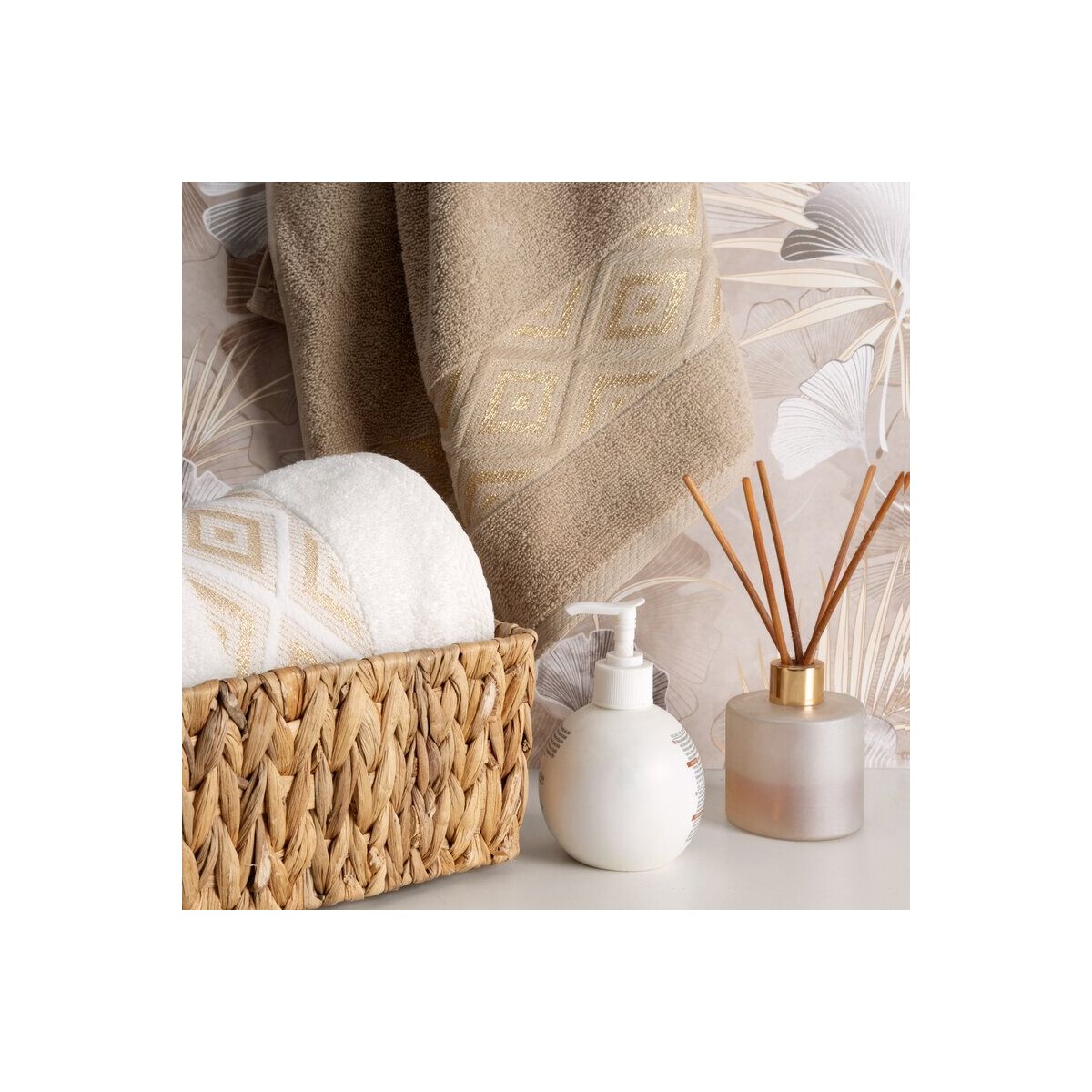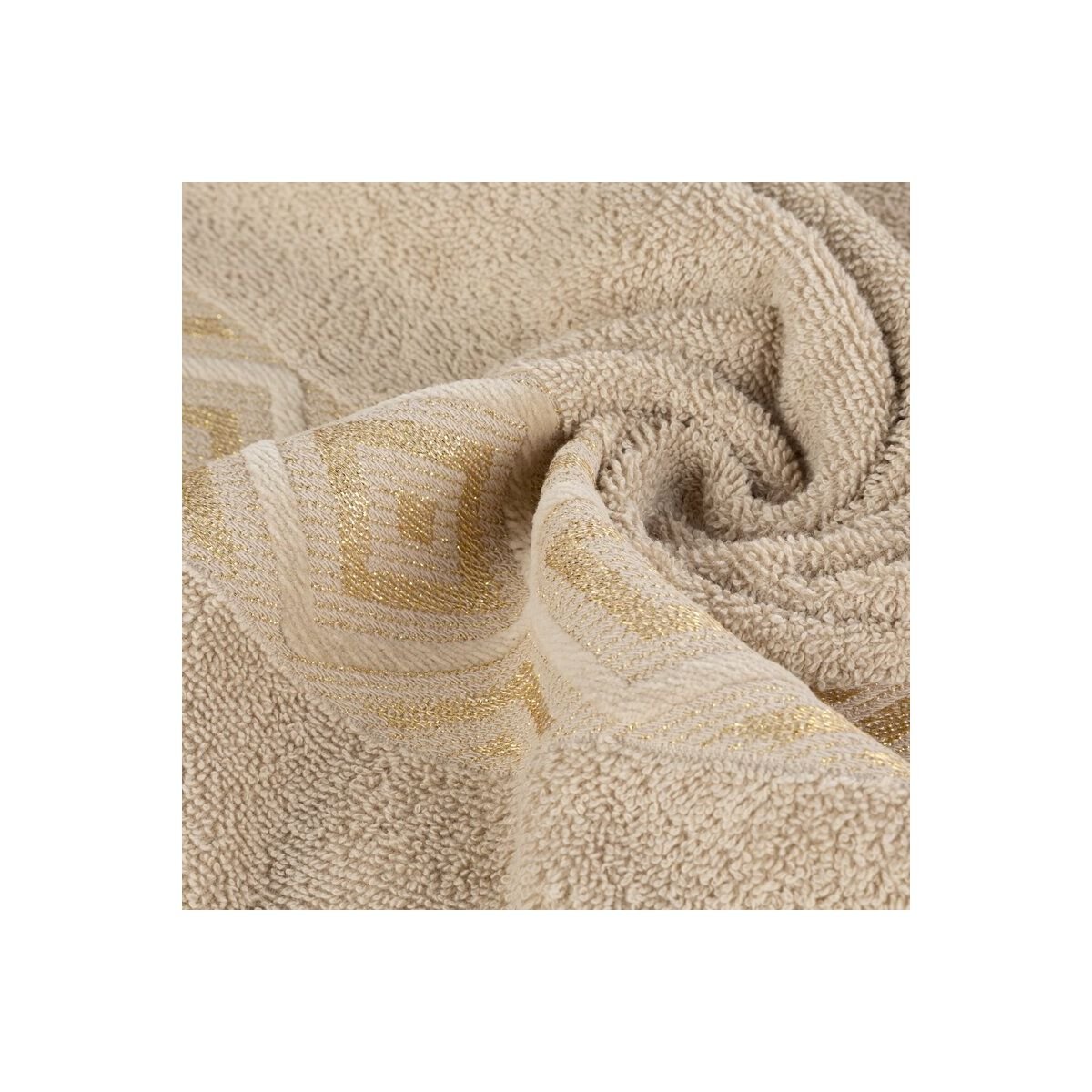 Dekoratiivse veluuräärega rätik, millesse on põimitud sädelev niit. Laius: 70 cm, Pikkus: 140 cm, Värv: Beež, Kaal: 500 GSM, Koostis: 96% Puuvill, 4% Polüester.