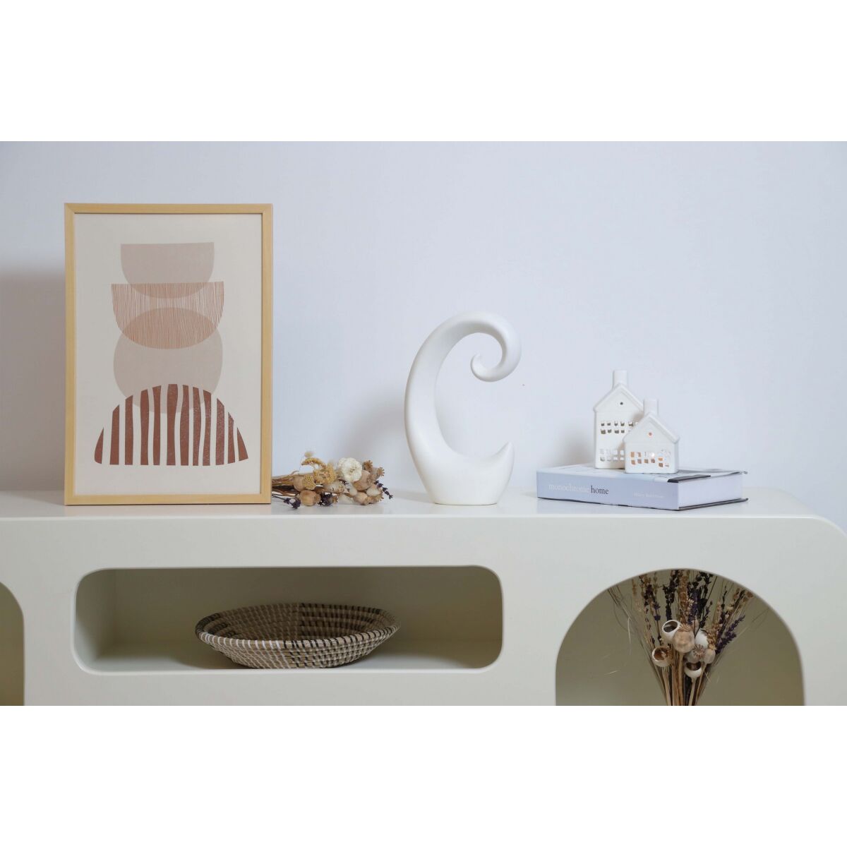 Selle dekoratiivse objekti klanitud valge värv lisab igale ruumile elegantsi ja keerukuse. Selle minimalistlik disain võimaldab tal sujuvalt sulanduda mis tahes stiiliga, muutes selle mitmekülgseks ja ajatuks tükiks.