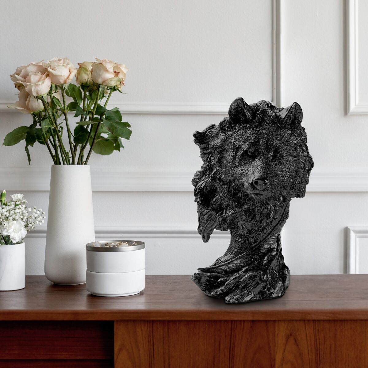 Oma elegantse musta värviga täiendab see dekoratiivse ese vaevata iga sisekujundust, olgu see siis kaasaegne, minimalistlik ruum või traditsiooniline, hubane tuba. Selle mitmekülgne disain võimaldab teil paigutada selle riiulile, kaminale või kohvilauda, muutes teie ruumi koheselt elegantse ja stiilse õhkkonnaga paradiisiks.