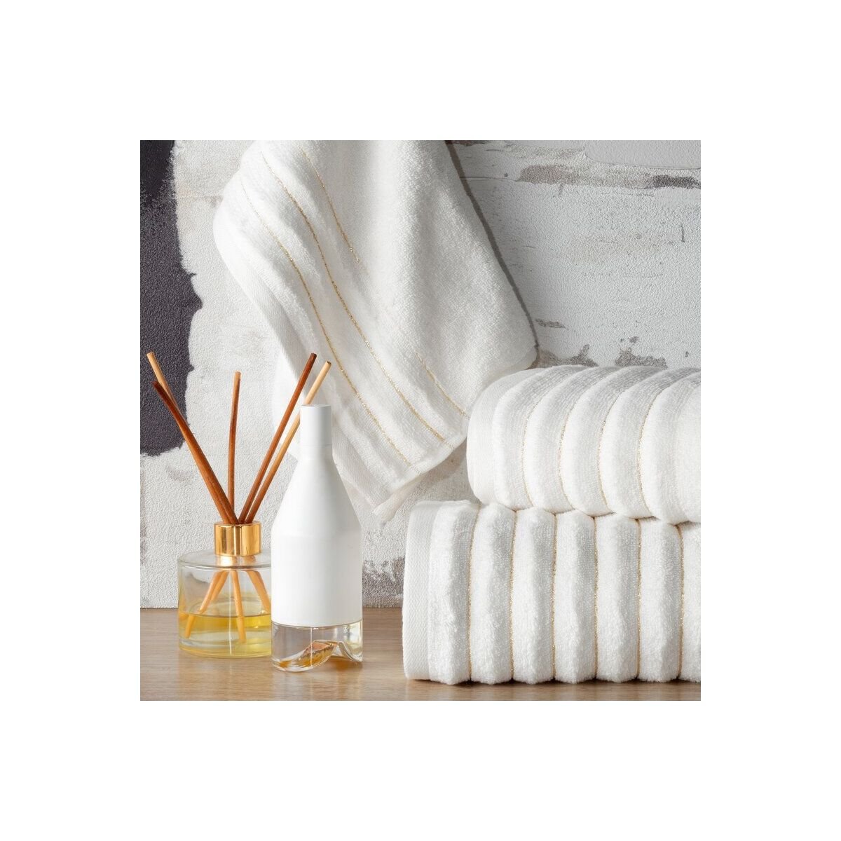 See elegantne kreemjas rätik sisaldab kaunist dekoratiivset äärist, mis on põimitud säravate niitidega. Täpselt valmistatud mõõtudega 70 cm laiuses ja 140 cm pikkuses, pakkudes rikkalikku katvust ja optimaalset mugavust. Kaaludes 500 GSM, tõotab see erakordset imavust ja pehmust. Valmistatud 100% puuvillast põhiosa jaoks ja 100% polüestrist dekoratiivse osa jaoks, ühendades vastupidavuse stiiliga. Ideaalne lisandus luksuslikuks elemendiks teie vannitoasisustusesse.