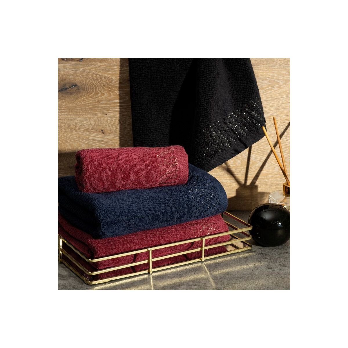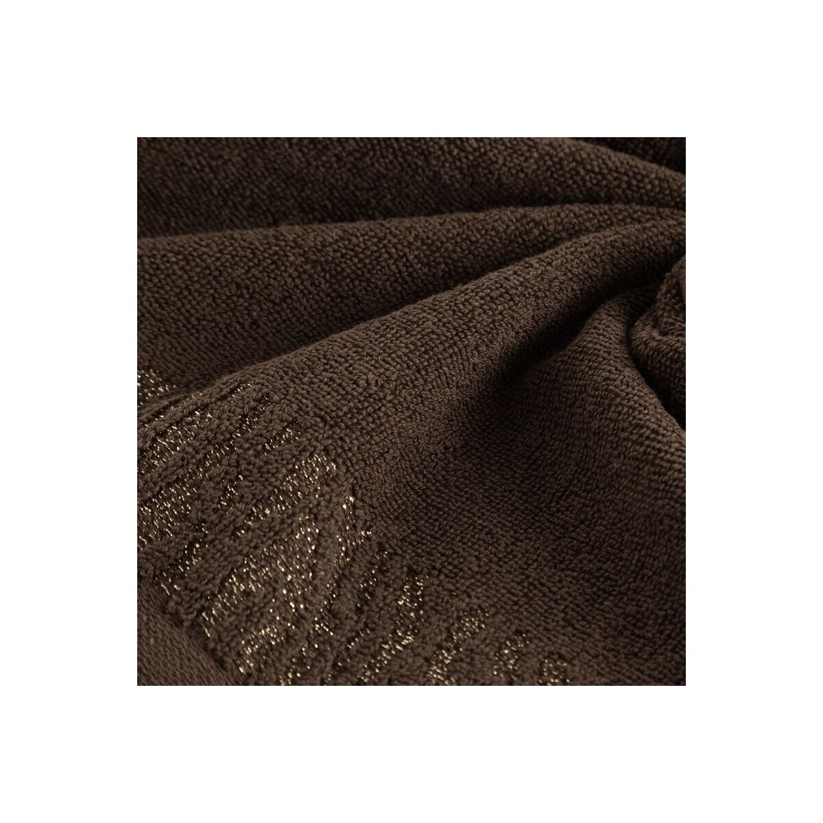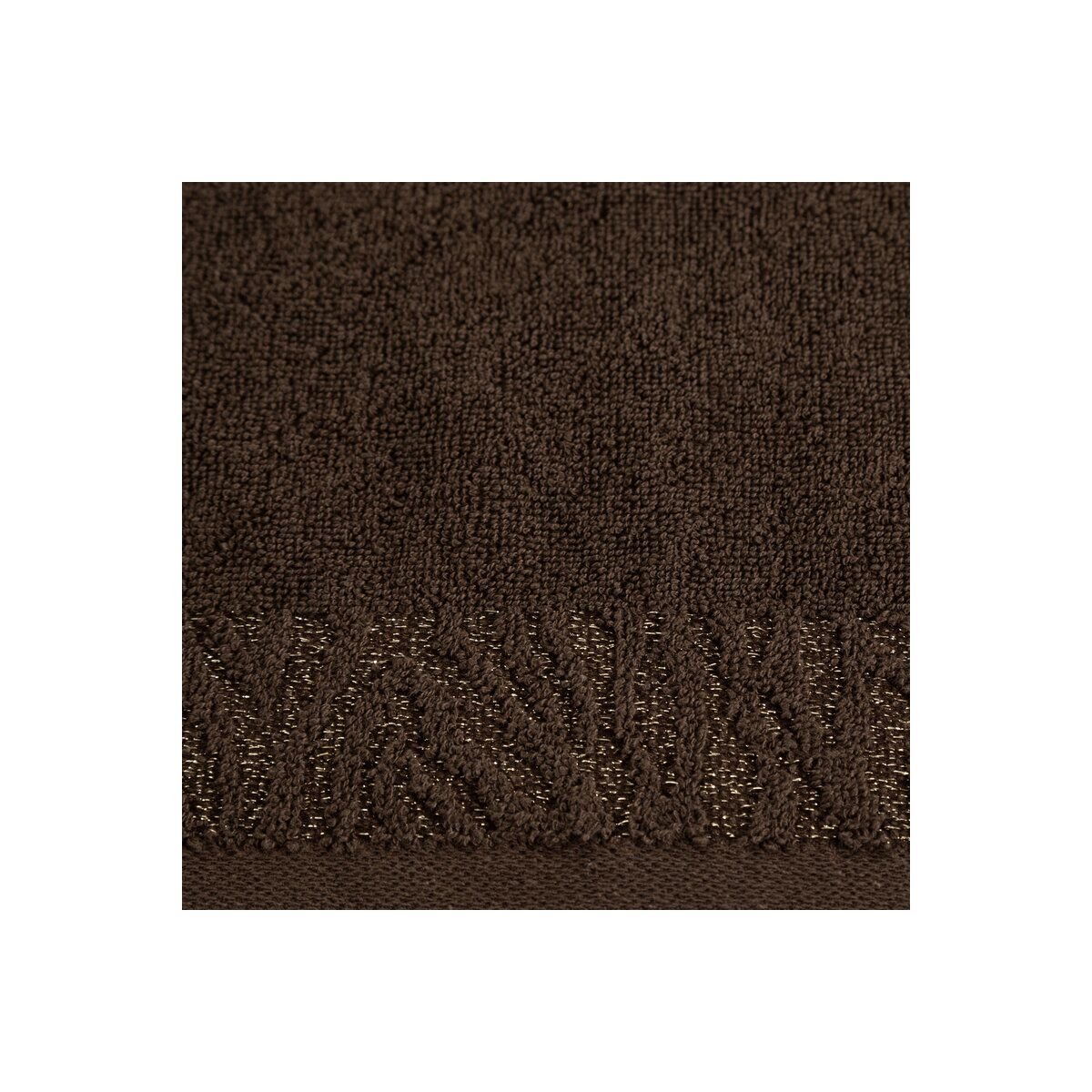 Puuvillane rätik, millel on läikiva niidiga läbikootud dekoratiivne äär. Mõõtmed: laius 30 cm, pikkus 50 cm, värv: pruun. Kaal: 500 GSM. Koostis: 100% puuvilla; dekoratiivne osa: 50% puuvill, 50% polüester.
