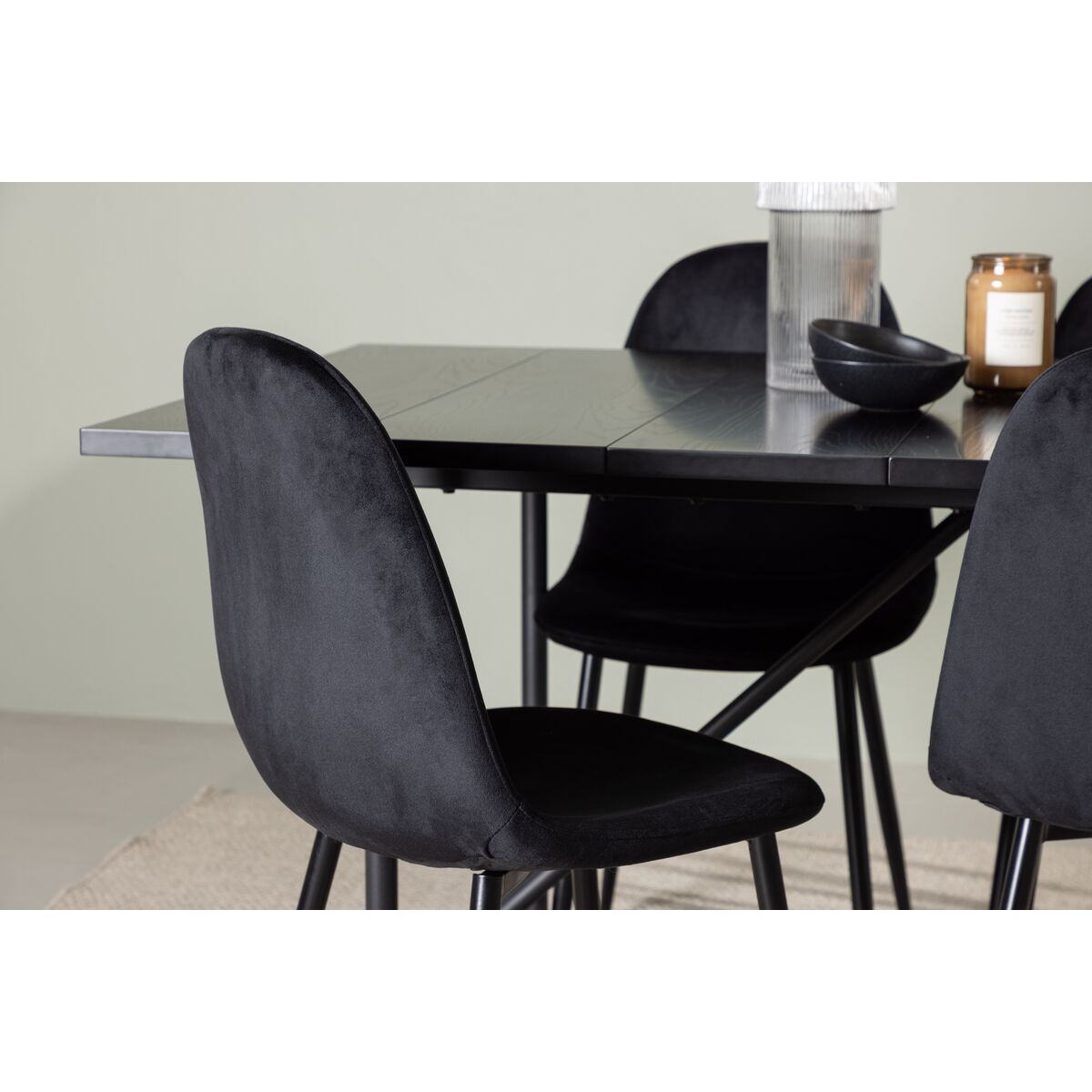 Tutvustame stiili ja funktsionaalsuse täiuslikku ühendust: Polar & Astridi söögikomplekt. See kaheosaline mustade söögitoatoolide komplekt koos ristkülikukujulise söögilauaga pakub viimistletud söögikogemust, millel on stiilne, kaasaegne esteetika. Polar toolid on kaetud luksuslikus, pehme musta polüesterveluuriga, tagades erakordse mugavuse vahtpolstri abil. Nende kergelt ümardatud seljad ja kitsad istmed toetuvad tugevatele terasest jalgadele — elegantsi ja vastupidavuse sulam.