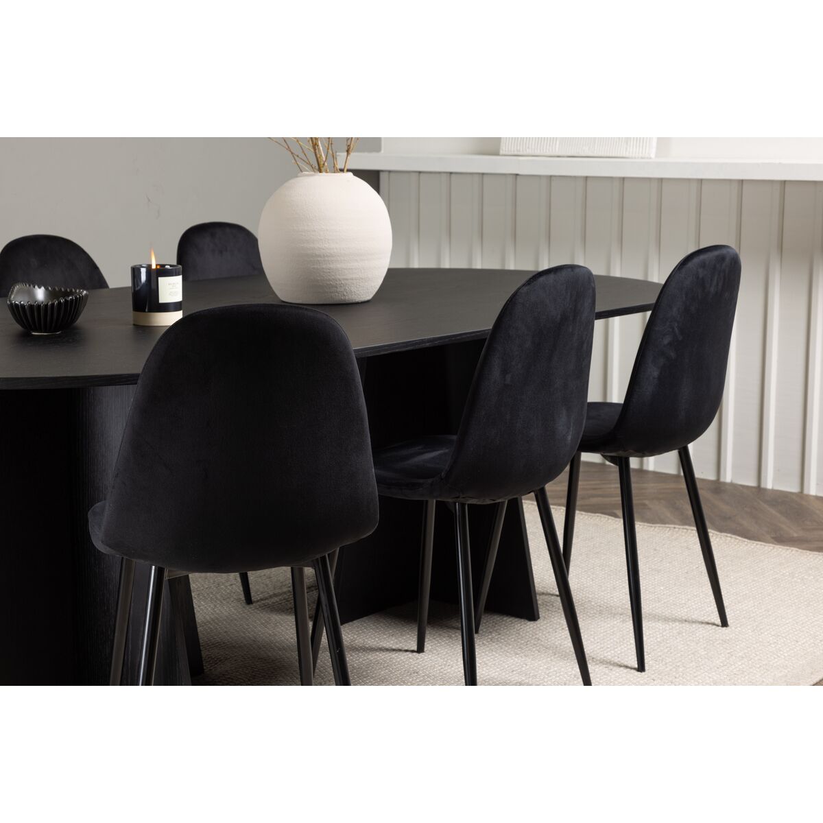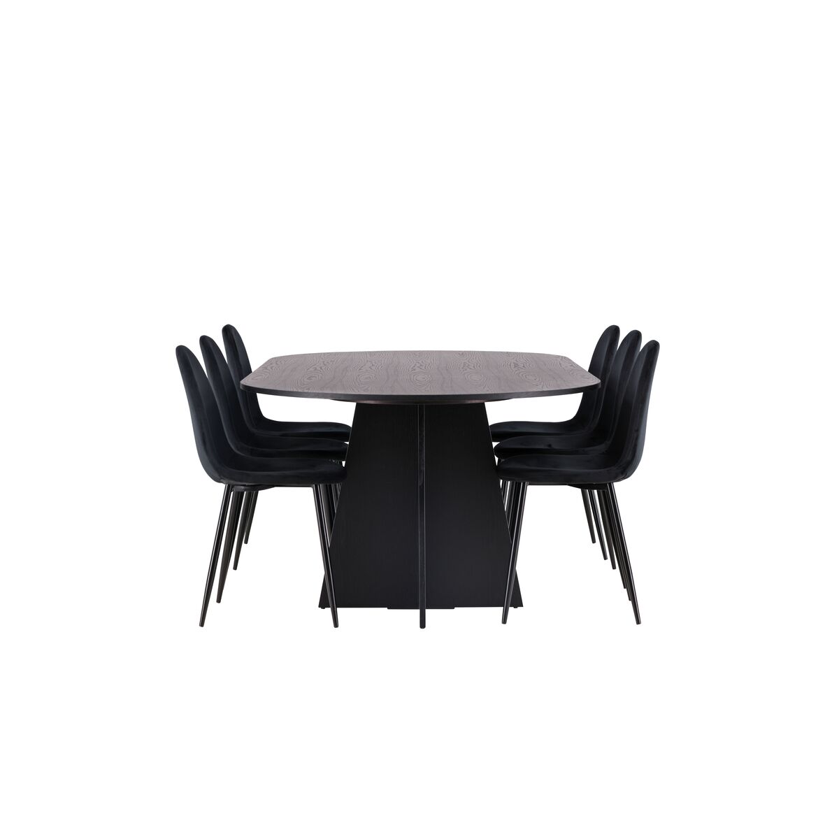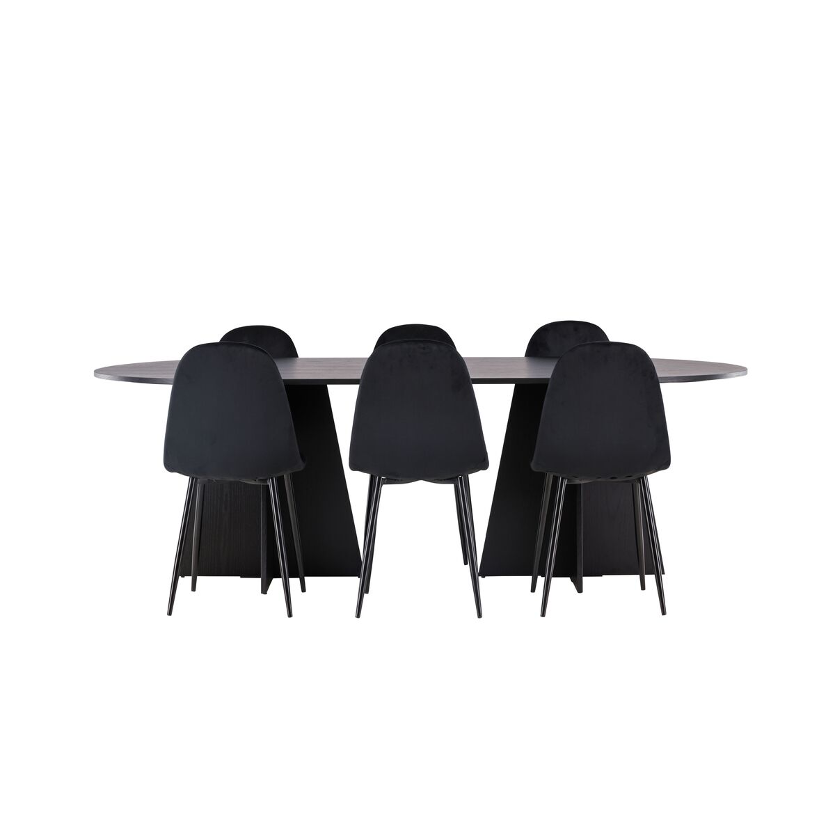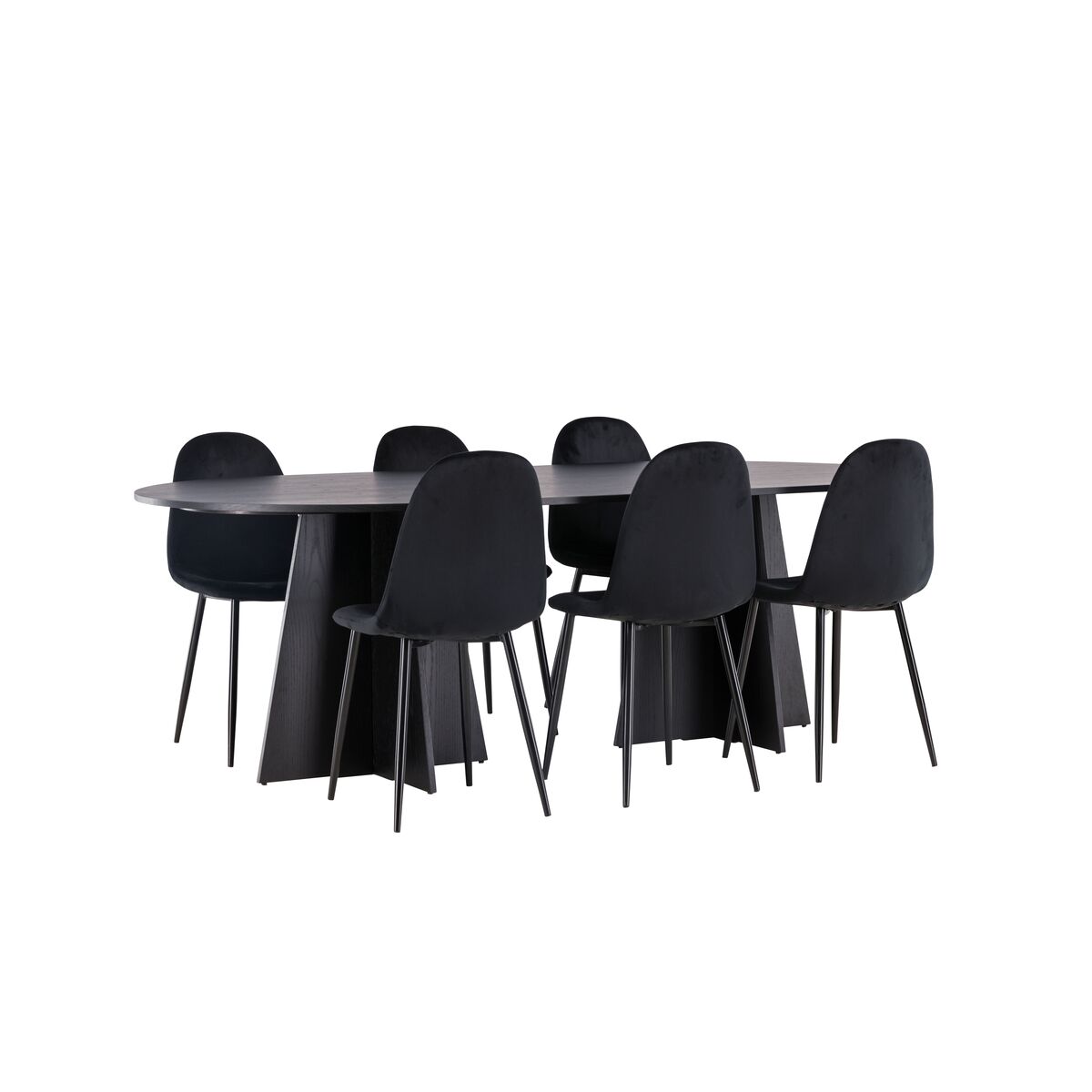 Pehmed vormid ja mustad värvid loovad ajatult stiilse söögitoa komplekti! Meie ovaalne söögilaud Bootcut on ainulaadse disainiga, kus must MDF-ist vineeriga laual on ovaalne kuju ja silmapaistev raam koos kahe koonusja jalaga avatud disainis. Stiilses kombinatsioonis mustade söögitoolidega Polar seeriast. Tool on täielikult polsterdatud, musta pulbervärvitud metalljalgadega ning ümarate seljatoe ja istmega mustast velvetkangast pehme polstriga. Istu mugavalt juba täna! Laual on mõõdud 230×115 cm.