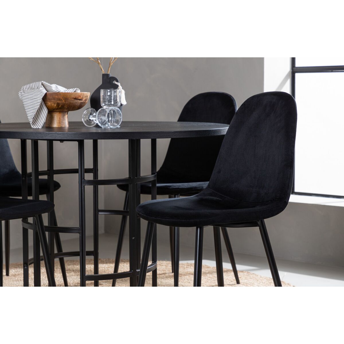 Stiilne, moodne ja ajatu – söögikomplekt, mis avaldab teie külalistele muljet! See trendikindel söögilaud Kopenhaageni sarjast kuulub Mööbli Moodi kollektsiooni ning sellel on MDF-i ja spooni mattmust lauaplaat ning dekoratiivne, silindrikujuline alus musta metalliga. Koos meie mugavate söögitoolidega Polar sarjast. Tool on täielikult polsterdatud, sellel on ümar seljatugi ja iste mustast sametkangast pehme polstriga ning jalad musta pulbervärvitud metallist. Ärge leppige kompromissidega mugavuse ja disaini vahel!