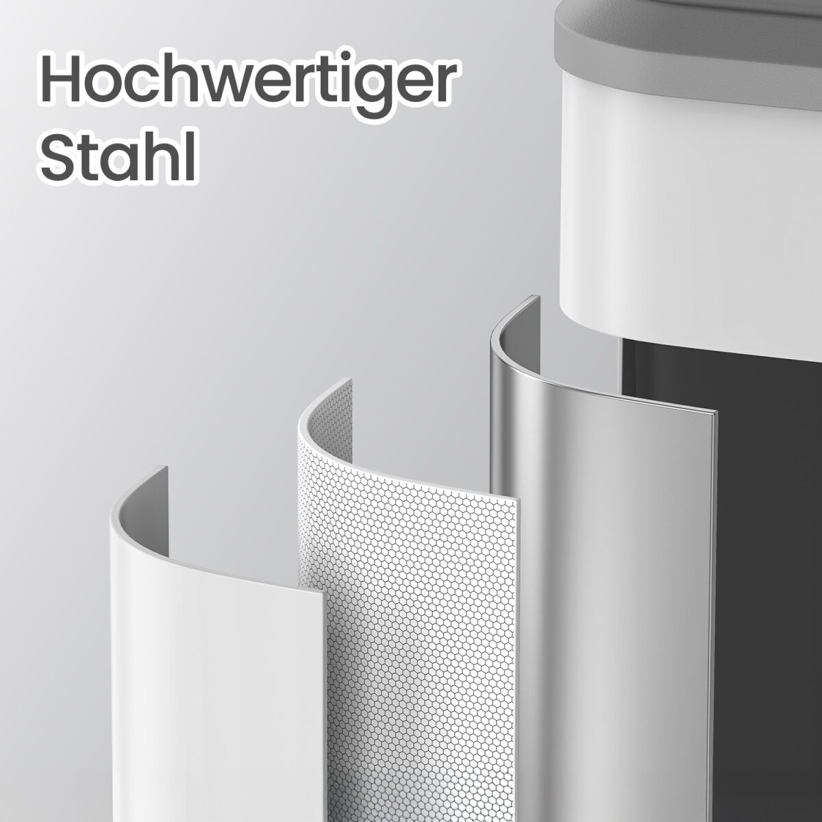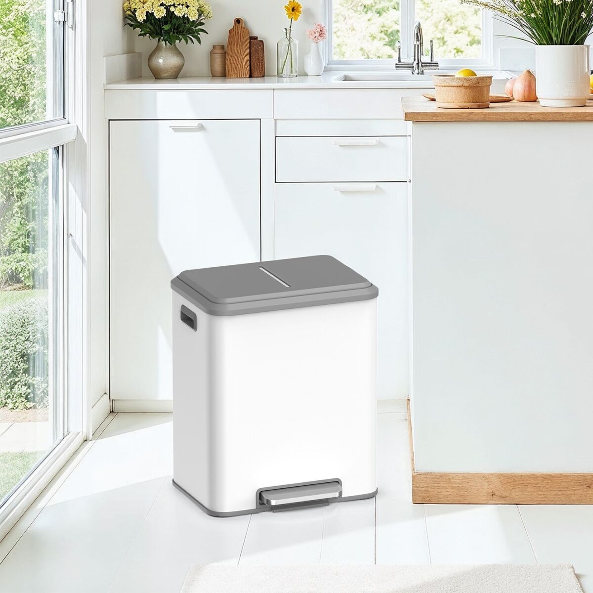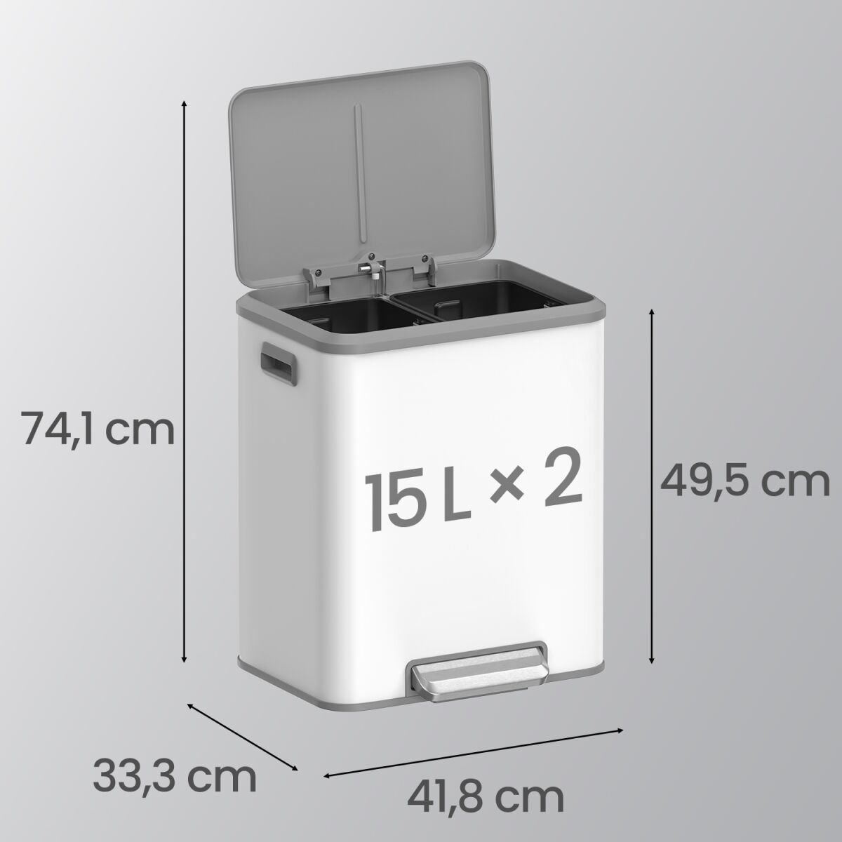 See SONGMICS prügikast ühendab praktilisuse ja kaasaegse disaini. Kaks sektsiooni muudavad prügivedamise ja taaskasutuse haldamise lihtsaks ja sujuvaks. Valmistatud vastupidavast terasest, pehme sulgumisega kaane ja laia, tugeva pedaaliga, on see ideaalseks valikuks puhta ja korras köögi jaoks. Pilvevalge viimistlus tagab, et see sulandub sujuvalt igasse sisekujundusse.