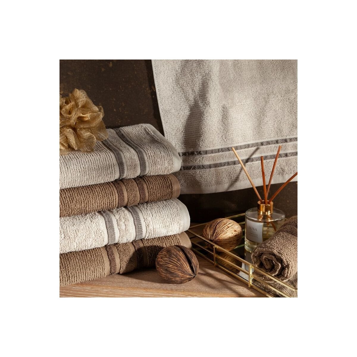 Veluurist rätik lihtsa äärega ja tekstuurse froteega. Mõõtmed: laius 50 cm, pikkus 90 cm. Värv: helebeež. Kaal: 500 GSM. Koostis: 100% puuvill, dekoratiivne osa sisaldab 50% polüestrit, 50% puuvilla.