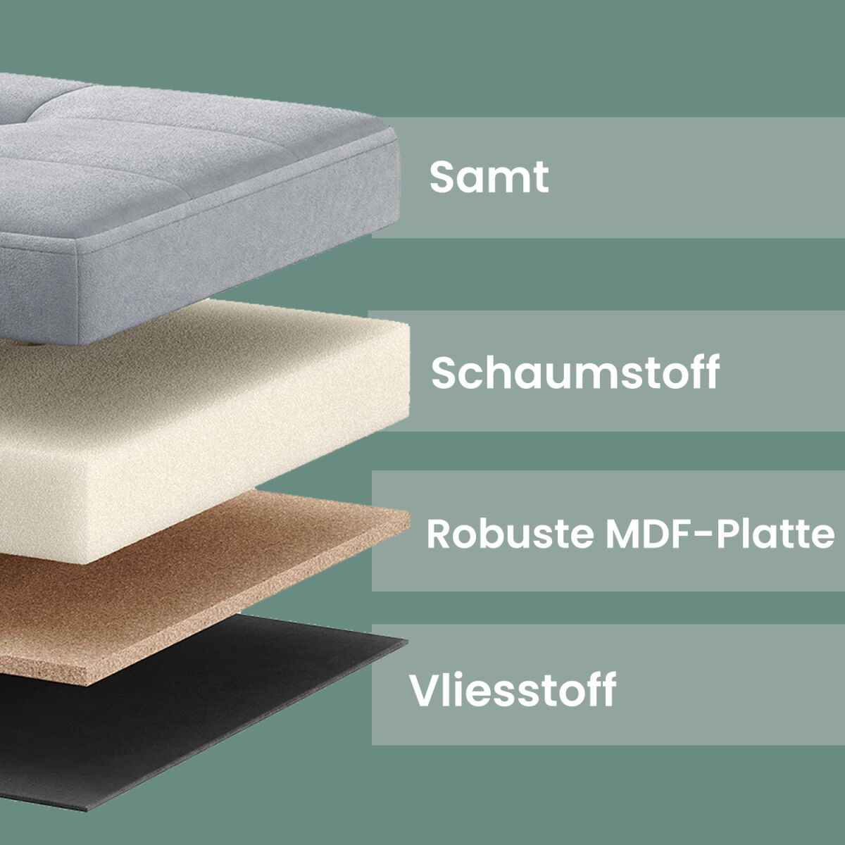 – Materjal: MDF (keskmise tihedusega puitkiudplaat), samet, vaht