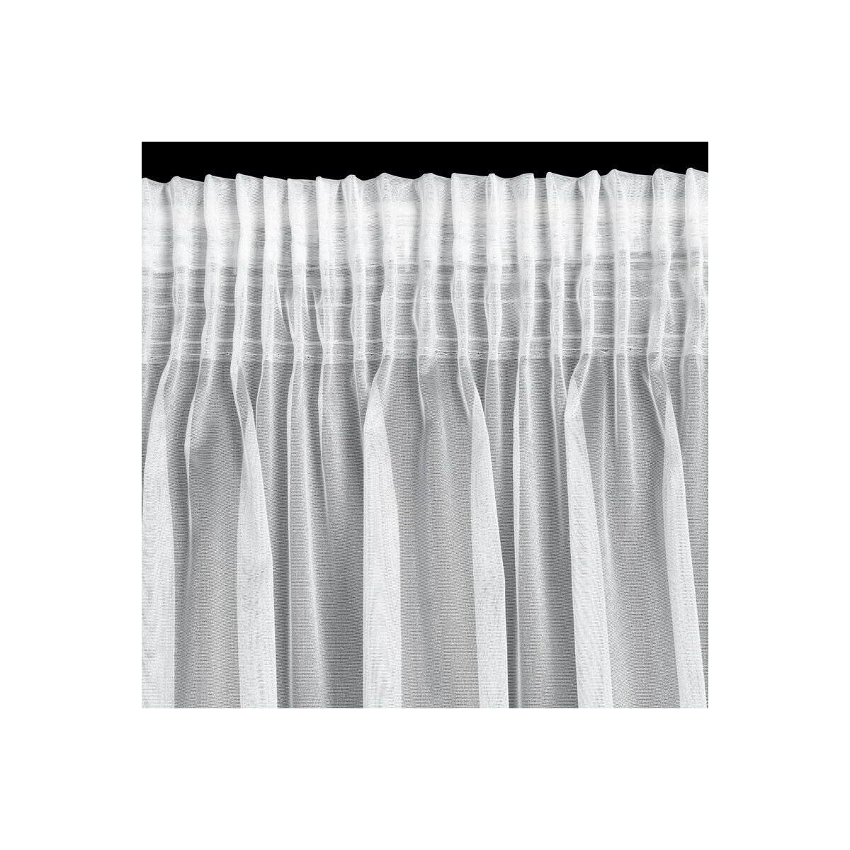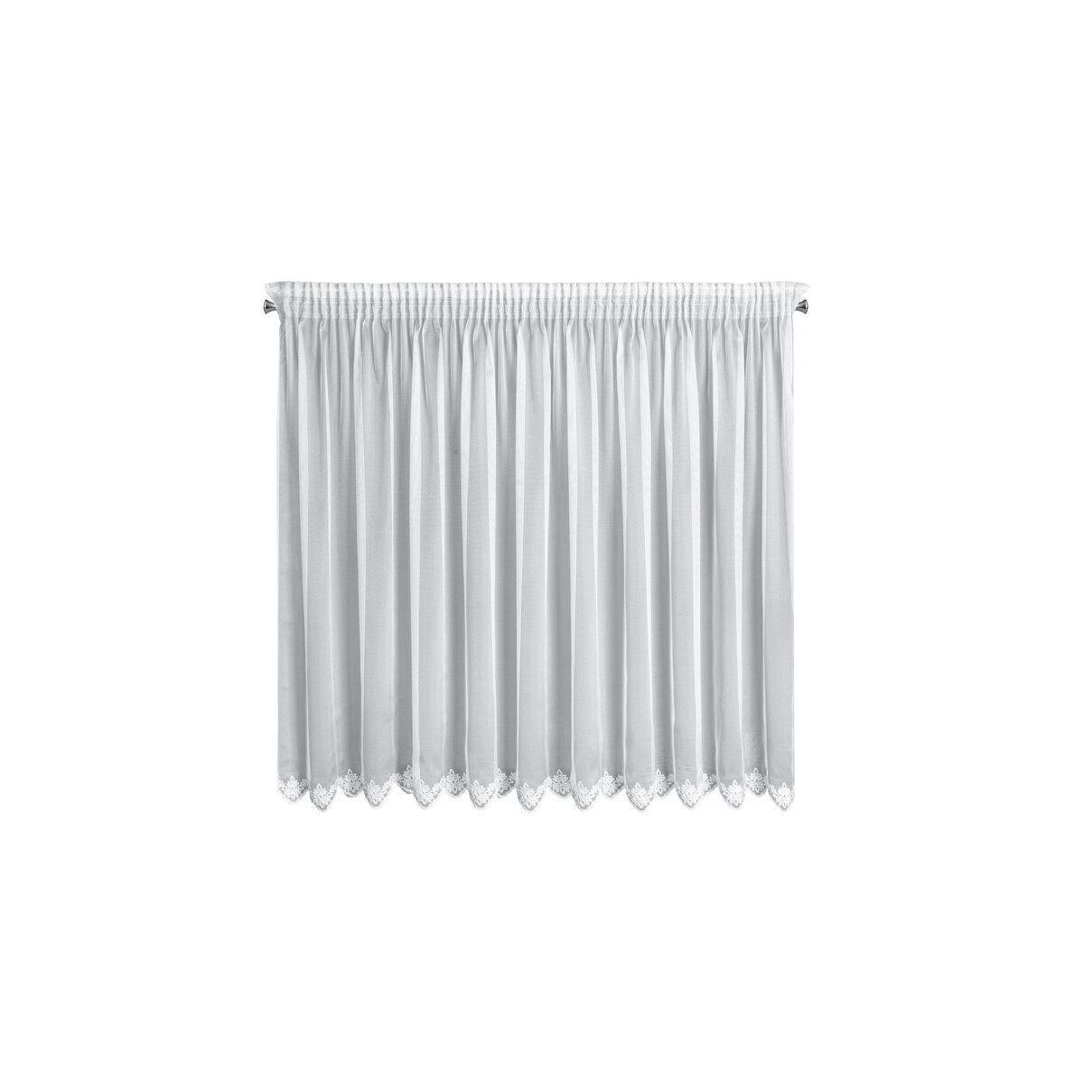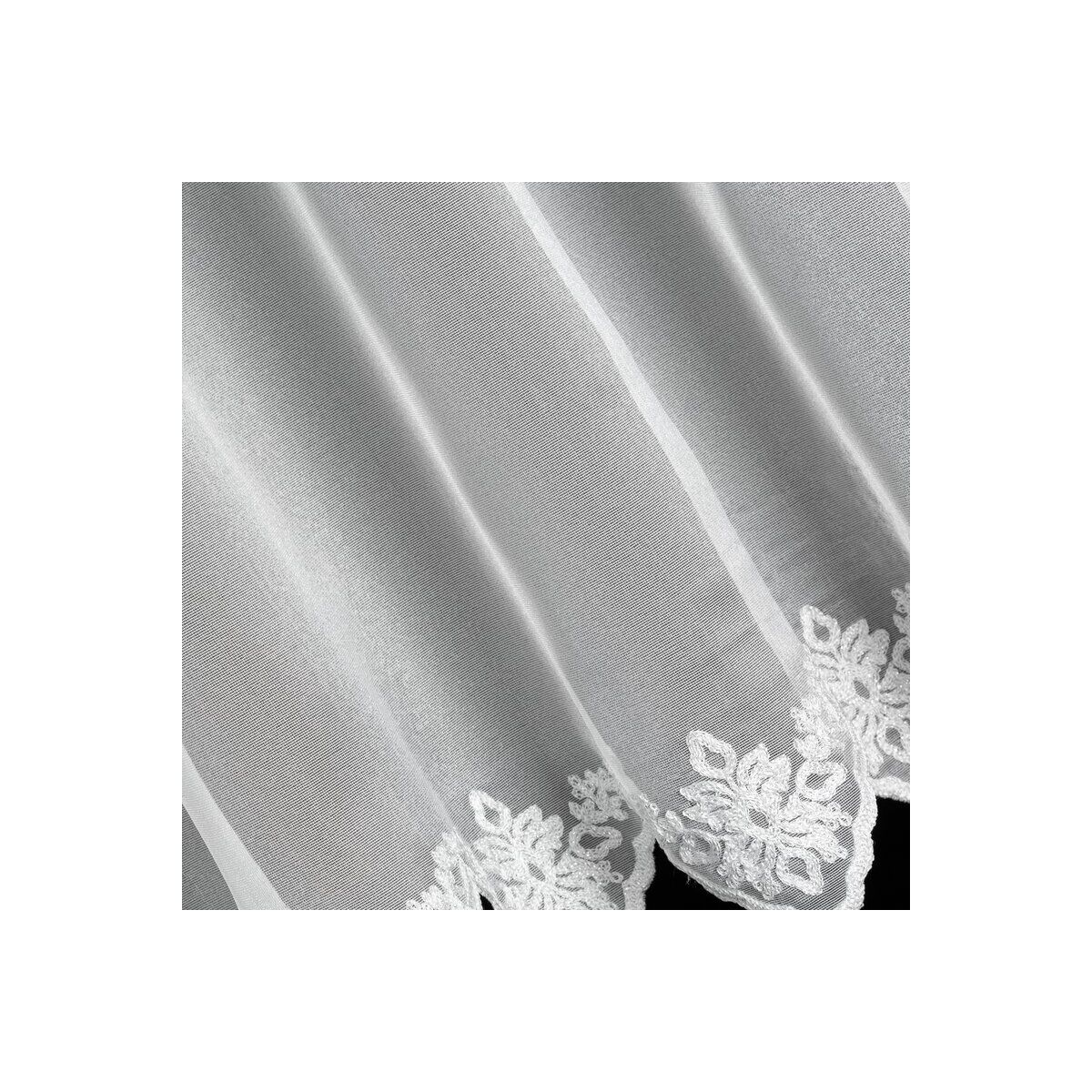 Eelvalmistatud kardin, ühtlase värviga kaunistatud tikandiga. Laius: 300 cm, pikkus: 145 cm, värv: Valge, kanga kaal: 70 GSM, koostis: 100% polüester.