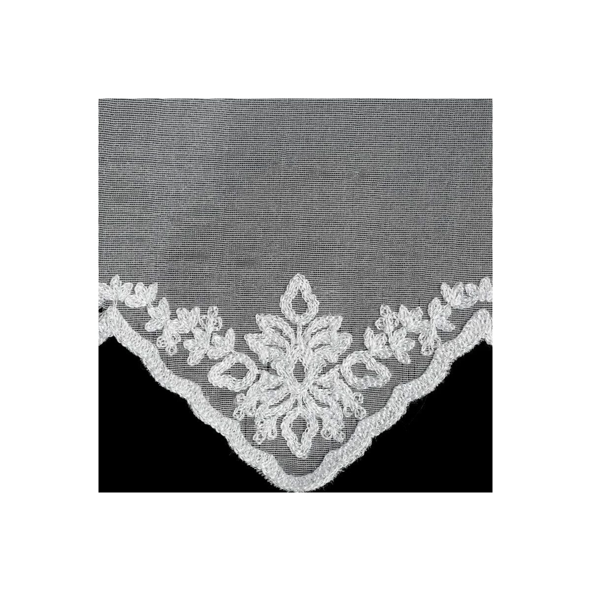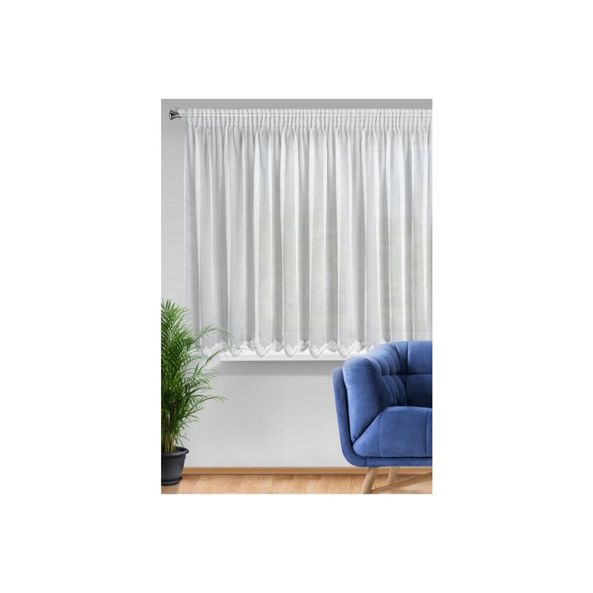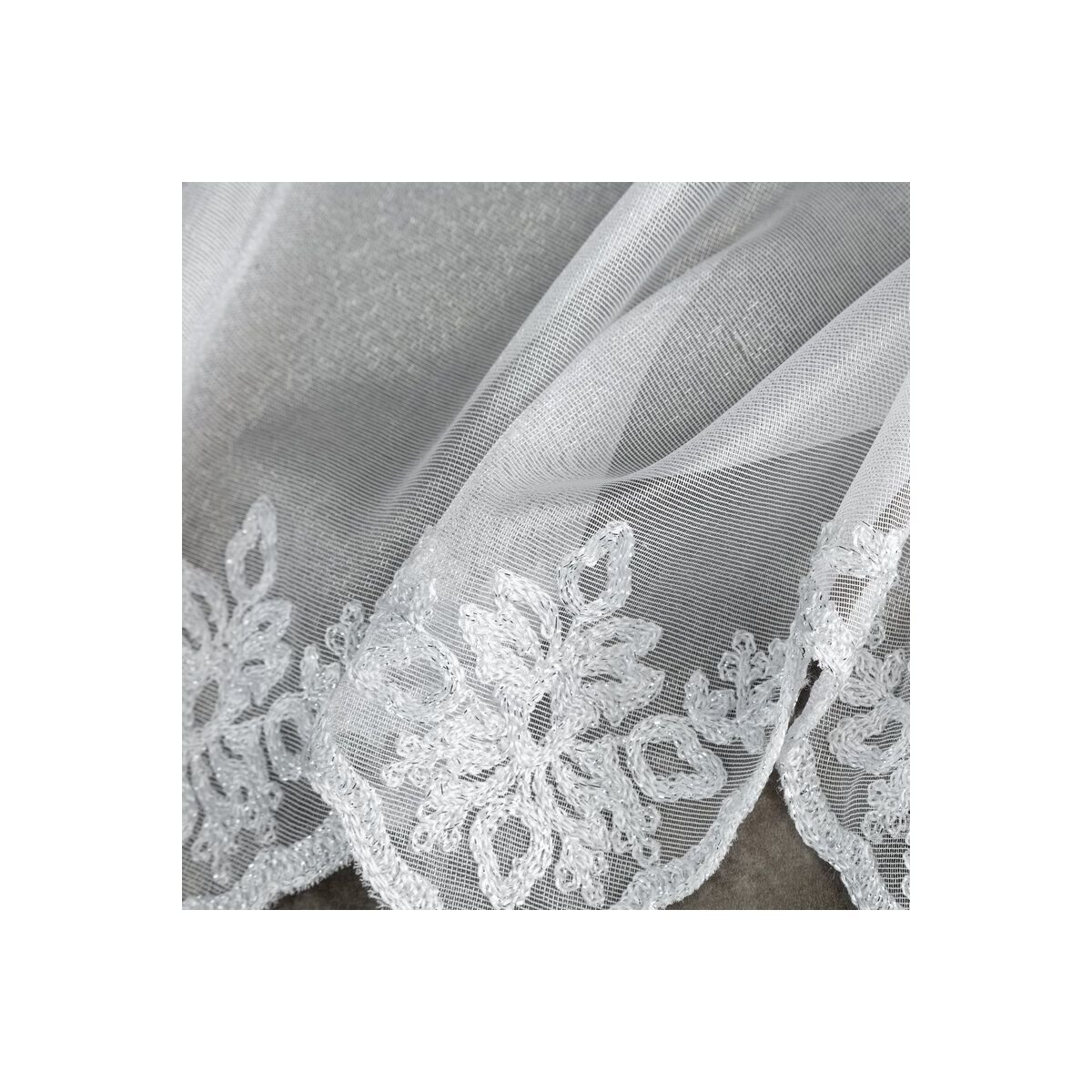 Eelvalmistatud kardin, ühtlase värviga kaunistatud tikandiga. Laius: 300 cm, pikkus: 145 cm, värv: Valge, kanga kaal: 70 GSM, koostis: 100% polüester.