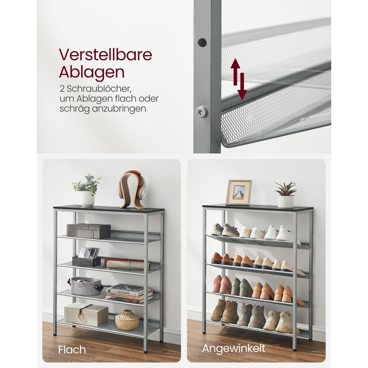 See kingariiul ühendab vintage-pruuni ja tindi-musta tooni elegantse tööstusliku disainiga, muutes selle igas esikus või koridoris pilkupüüdvaks. Reguleeritavate võrkriiulitega pakub see rohkelt hoiustamisruumi viiel tasemel, pakkudes suurt pindala teie kingadele või tarvikutele.